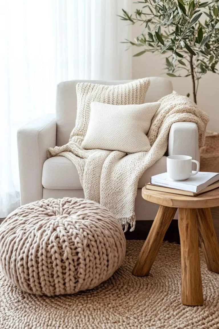 Create a warm reading nook with a beige armchair, soft blanket, and small table with a candle or diffuser. Add a textured rug beneath to complete the snug, peaceful retreat for winter days indoors.