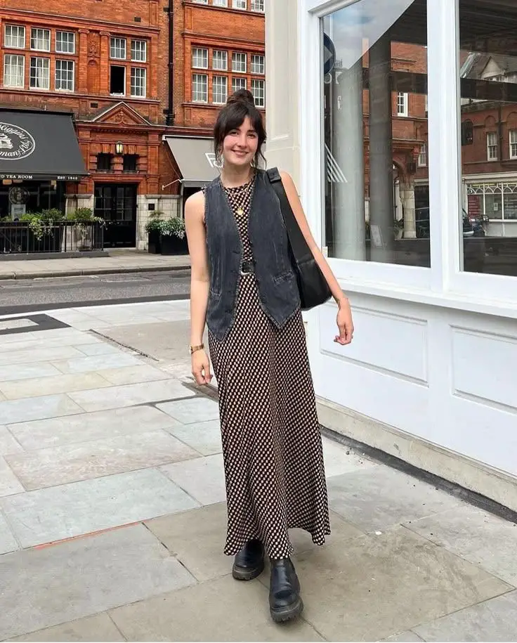A maxi brown dress feels like the ultimate autumn essential—warm, grounding, and effortlessly chic. Layer it with a sleek black vest to add contrast and structure, creating a balanced mix of casual and stylish. This pairing works well with chunky loafers or knee-high boots, and you can accessorize with layered necklaces or a crossbody bag. It’s a versatile look that transitions seamlessly from daytime errands to a cozy dinner, making it a timeless fall staple with a modern twist.