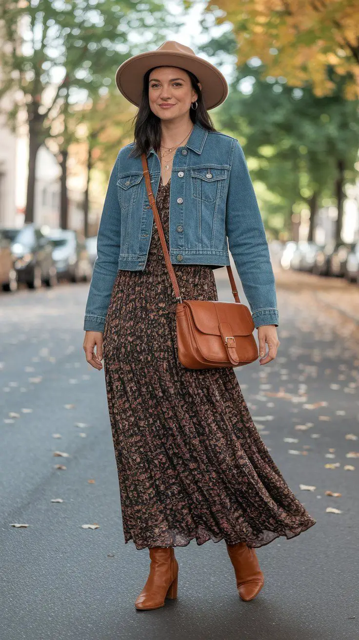 A fall floral dress instantly brings a touch of romance to your wardrobe, and pairing it with a cropped denim jacket keeps the look laid-back yet stylish. The floral pattern adds warmth and charm, while the denim creates balance by giving it a casual twist. Finish the outfit with ankle boots and a crossbody bag for an effortlessly chic everyday vibe that works for coffee dates, brunch, or a weekend stroll.