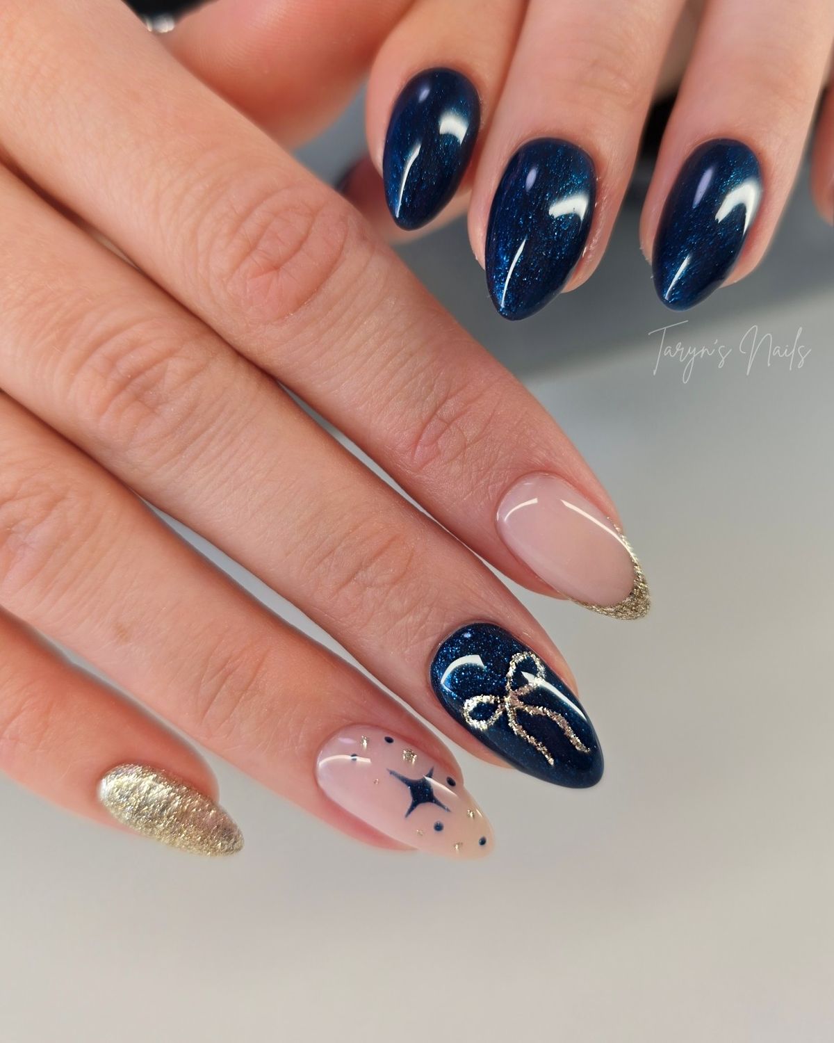 If you’re craving sparkle, pair a shimmering base color with gold bow details. Use glitter polish as your foundation and add small gold decals or hand-painted bows to a couple of nails for a luxe, glamorous effect.