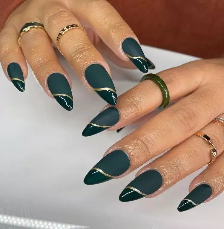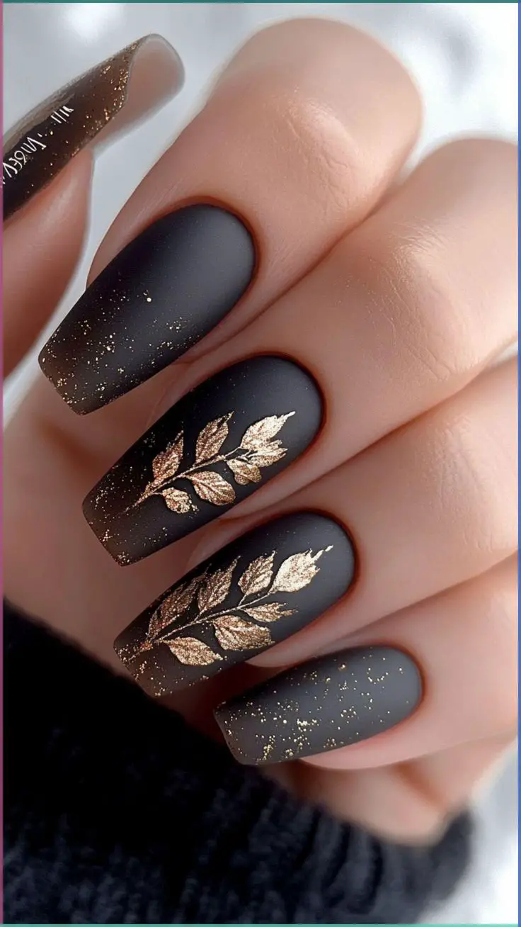 For a moody yet earthy fall manicure, forest green matte nails are a must-try. This deep shade brings a grounded, natural vibe that pairs perfectly with fall layers and neutral outfits. The matte finish tones down the intensity, giving the green a modern, sophisticated twist. Ideal for square or coffin-shaped nails, this look works as a statement all on its own or with subtle gold line art for added detail. It’s a refreshing alternative to black while still keeping that moody seasonal charm.