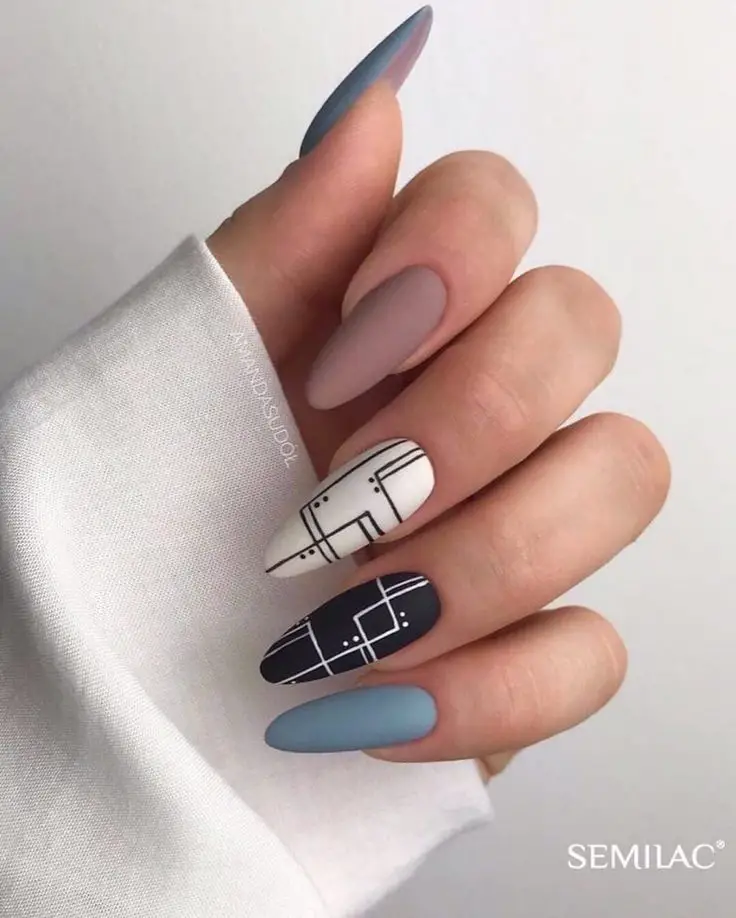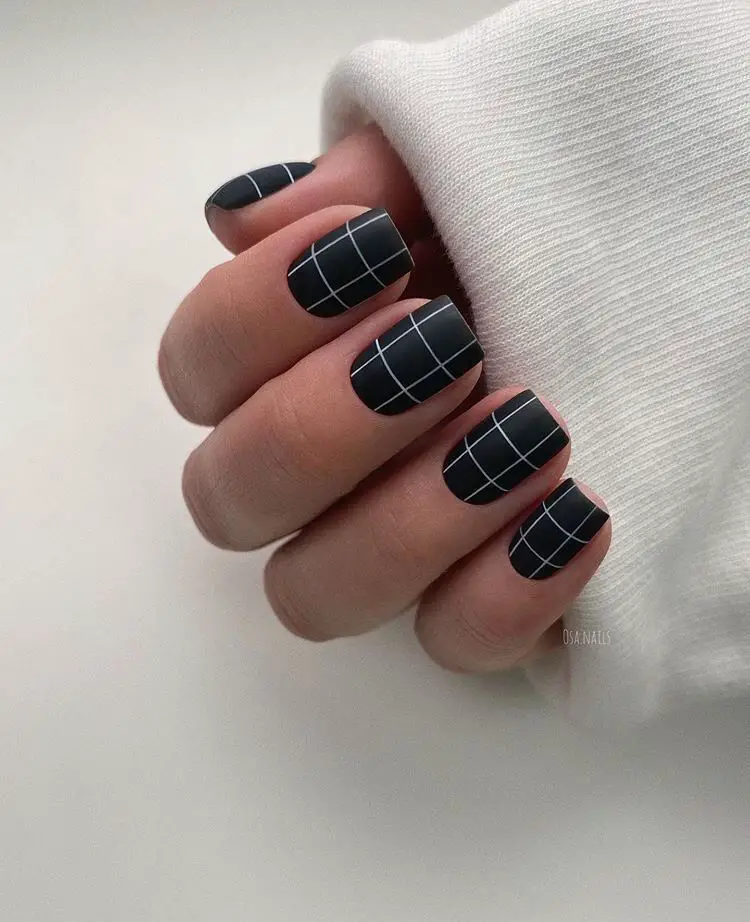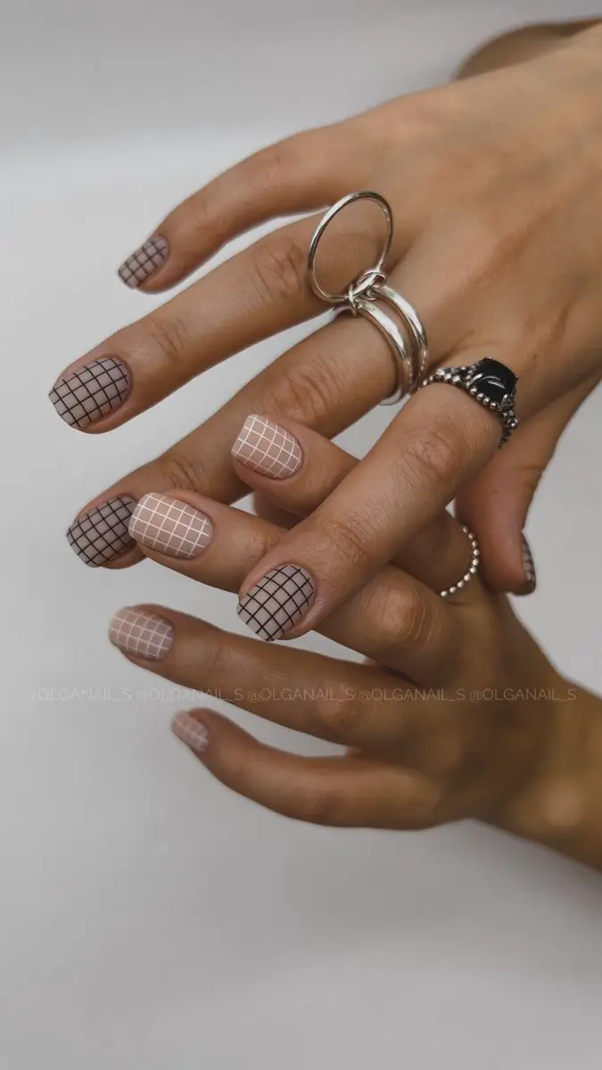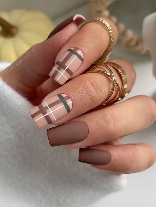 fall’s most iconic patterns, and when paired with a matte finish, it becomes a total style statement. Neutral plaid matte nails blend beige, cream, and taupe tones with thin black or brown lines, giving your mani that cozy, preppy vibe. Think of them as the nail-art version of your favorite fall scarf—timeless, chic, and super versatile. These nails work beautifully on both short and long shapes, making them perfect for daily wear. Add a matte topcoat for that soft, velvety texture that elevates the whole look.