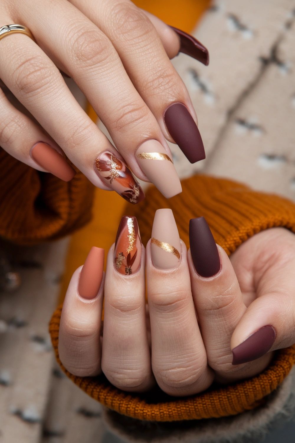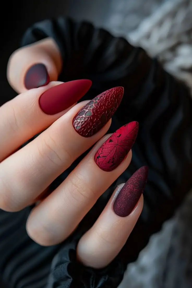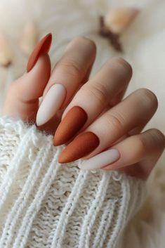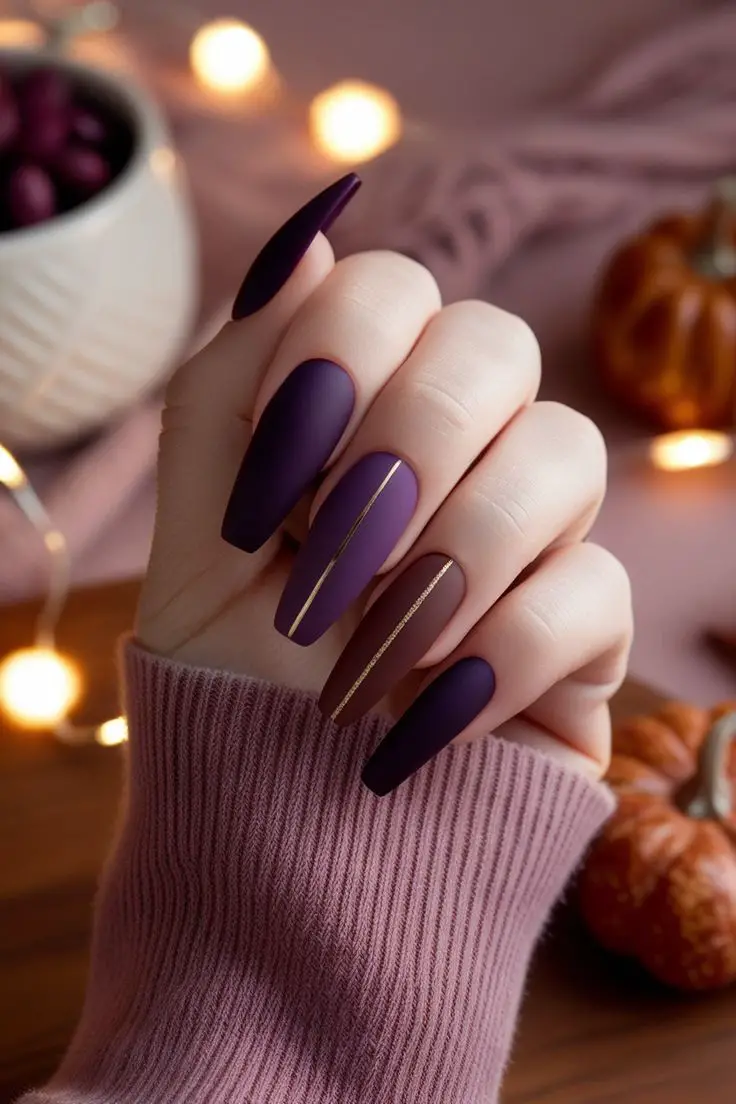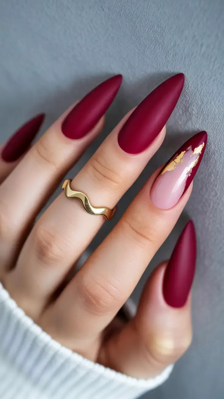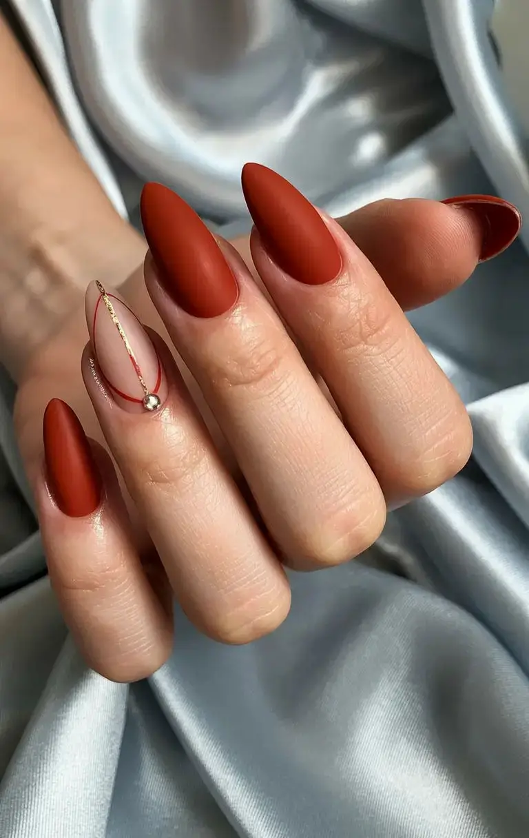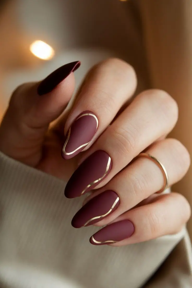 Burgundy is the ultimate fall nail color, and it gets an instant upgrade with a matte finish. On almond-shaped nails, this shade feels both feminine and fierce, striking that perfect balance between bold and elegant. The matte effect softens the deep tone, creating a velvet-like appearance that screams autumn romance. Pair this look with gold jewelry for extra luxe vibes, or keep it simple with a chunky knit sweater for effortless chic. Whether you’re heading to work or a weekend coffee date, these nails will always feel season-appropriate and stylish.