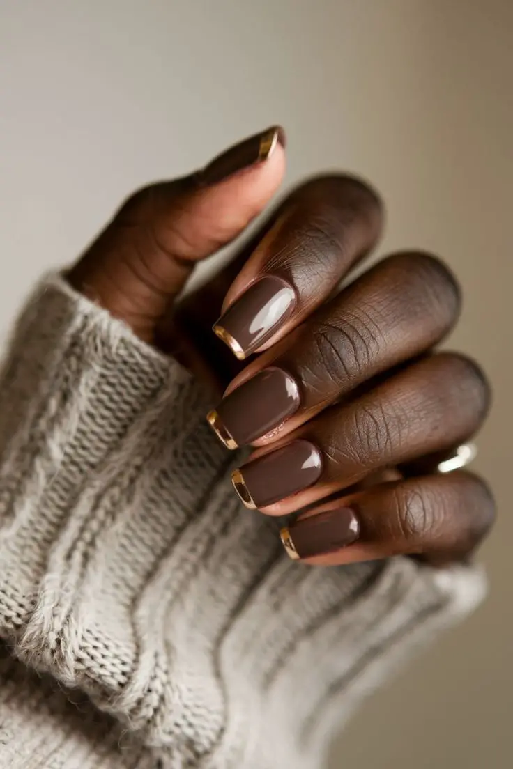 Classic brown nails never go out of style. This neutral shade strikes a balance between simplicity and elegance, making it a reliable choice for fall. On dark skin tones, brown nails enhance natural warmth while still looking effortlessly chic. Pair them with beige knits, denim, or bold statement coats for a cohesive seasonal style. You can keep it simple with one solid shade or elevate the look with glossy tips or metallic accents. Classic brown is the perfect go-to color when you want minimal effort with maximum polish.