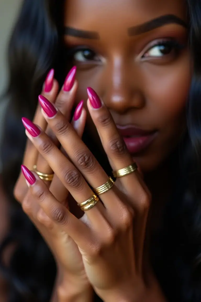 Rich magenta nails are the perfect mix of bold and feminine. This vibrant shade pops beautifully on dark skin, creating a fun, flirty manicure that’s still perfect for fall. It’s a great choice if you want a break from traditional earthy tones but still need something seasonally appropriate. Magenta pairs well with both black and neutral outfits, giving your look a chic contrast. Add a glossy finish to keep the vibrancy or try a metallic accent nail for a glam twist.