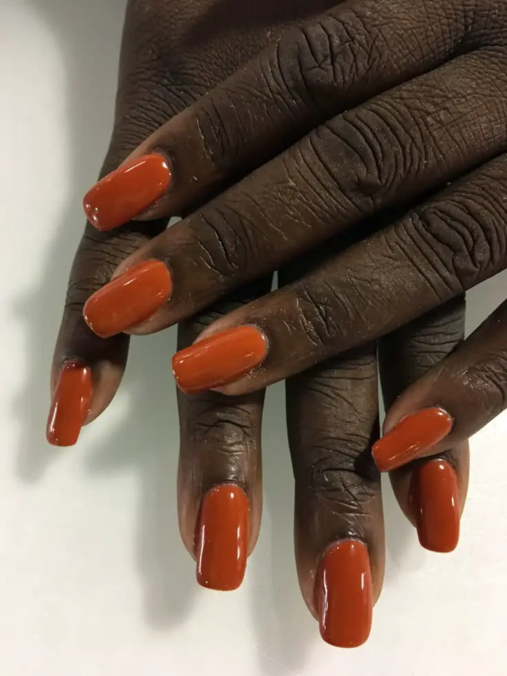 Burnt-orange nails are the ultimate fall vibe. This fiery shade reflects autumn leaves, pumpkin spice lattes, and cozy evenings. On dark skin, burnt-orange glows beautifully, creating a bold yet flattering manicure. Perfect for both casual fits and seasonal parties, it’s a statement color that radiates warmth. Opt for a glossy top coat for vibrancy or a matte finish for a chic, modern twist. Whether styled as a full mani or paired with nude accents, burnt-orange nails embody fall’s cozy yet stylish energy.