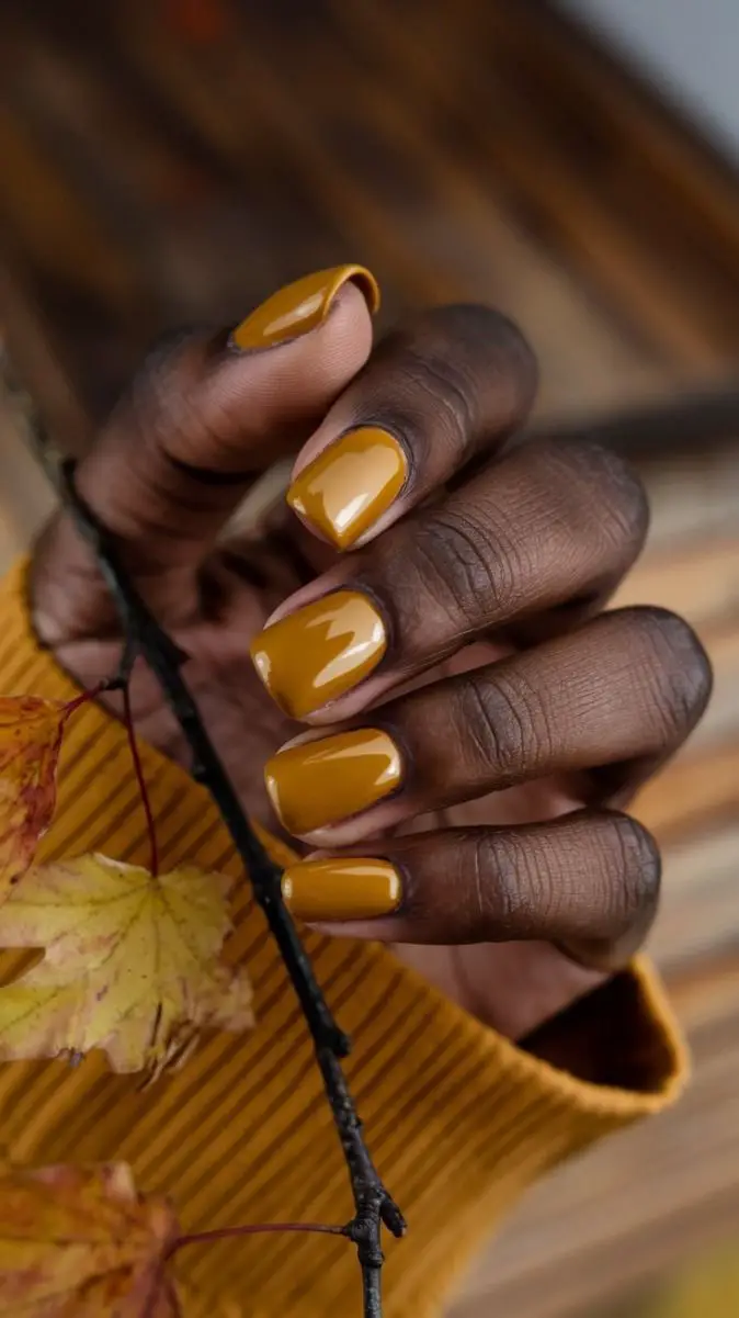 Yellow rust nails are the perfect blend of golden warmth and autumn earthiness. This shade radiates on dark skin, giving nails a bold, sun-kissed glow even in cooler months. Yellow rust nails pair perfectly with cozy knits, brown boots, and layered fall outfits. It’s vibrant without being overwhelming, striking the balance between fun and sophistication. Add a glossy finish for brightness or pair with matte textures for a grounded vibe. This unique shade is ideal for those who love standing out while staying seasonally chic.