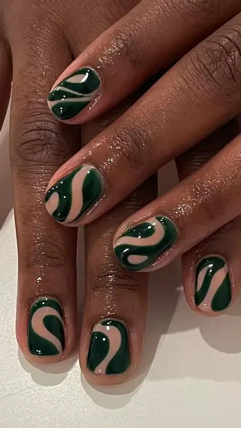 Deep green nails capture fall’s natural, earthy vibe with a bold twist. On dark skin, this jewel-toned shade looks both striking and elegant. Think forest green or hunter green shades that bring richness to your manicure. Deep green nails pair effortlessly with camel coats, beige knits, and cozy scarves. Opt for glossy finishes to enhance the depth of the shade or experiment with gold accents for an extra luxurious touch. This versatile color brings both grounded calmness and bold sophistication to your fall look.