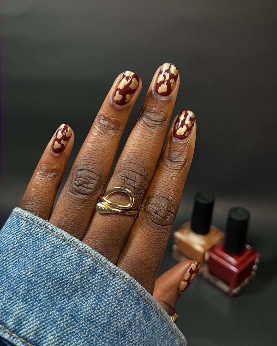 Gold and brown nails combine earthy tones with metallic glam for the ultimate fall look. This duo flatters dark skin by balancing warmth and sparkle in one chic manicure. Think deep brown bases with gold tips, glitter accents, or marbled patterns. This combo pairs perfectly with autumn’s fashion staples, from knit sweaters to leather boots. Whether you prefer subtle accents or bold gold statements, this nail look feels cozy yet luxe. It’s a versatile, trendy design that blends everyday wear with seasonal glam.
