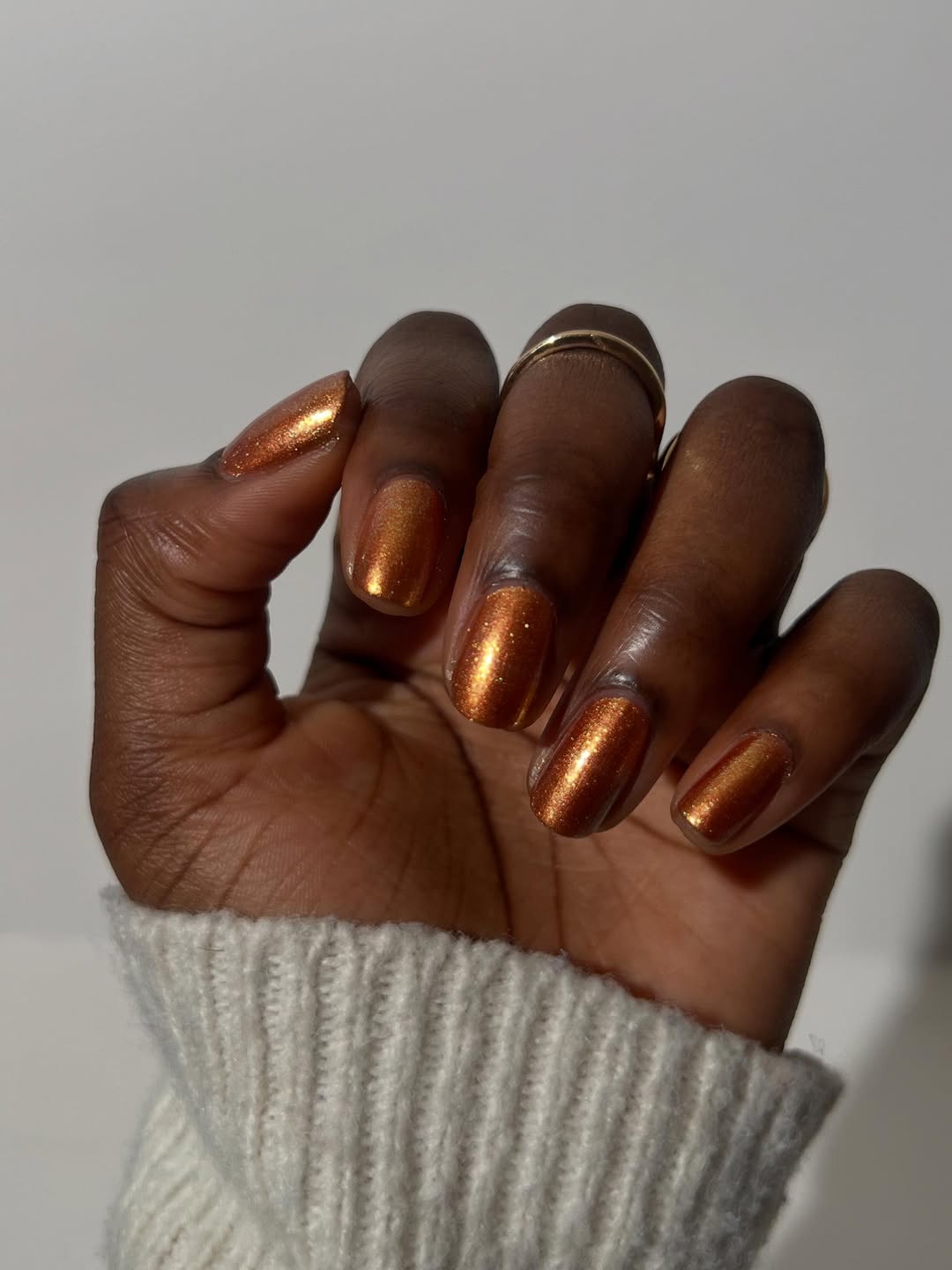 Chromic gold nails are pure glam for fall. This metallic shade gleams beautifully on dark skin, catching the light and adding instant sparkle to your manicure. Gold nails are perfect for festive occasions, nights out, or whenever you want to elevate your everyday look. They pair effortlessly with earthy neutrals, deep jewel tones, and classic blacks. Try a mirror-chrome finish for full-on drama or mix with matte browns for a chic balance. Gold nails are bold, timeless, and guaranteed to turn heads this season.