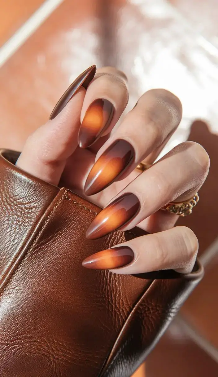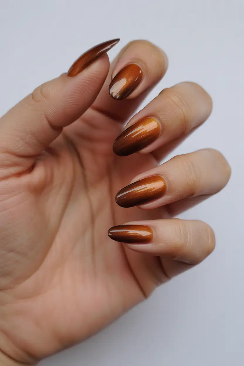 Metallic magic! This ombré blends rust into shimmering copper for a radiant fall-ready mani. Bold yet classy, it’s a statement look that shines under autumn light.