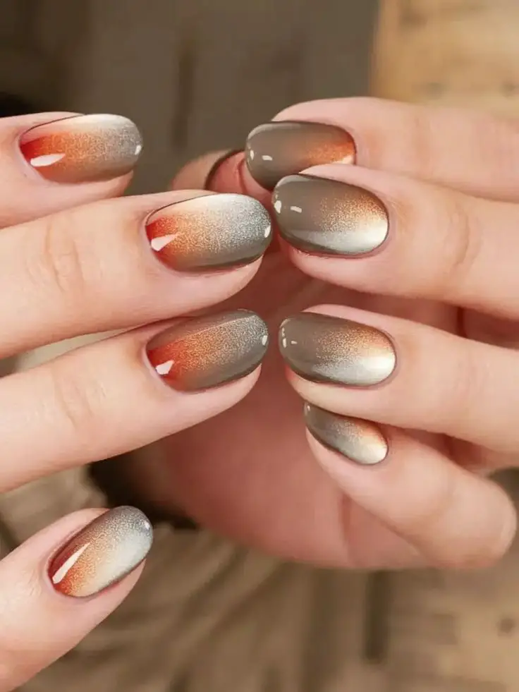 Soft taupe fading into gray creates a smoky yet neutral vibe. Chic and wearable, this ombré is subtle enough for everyday but still has a trendy autumn edge.