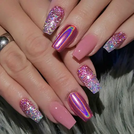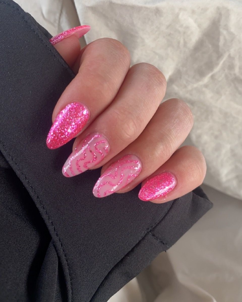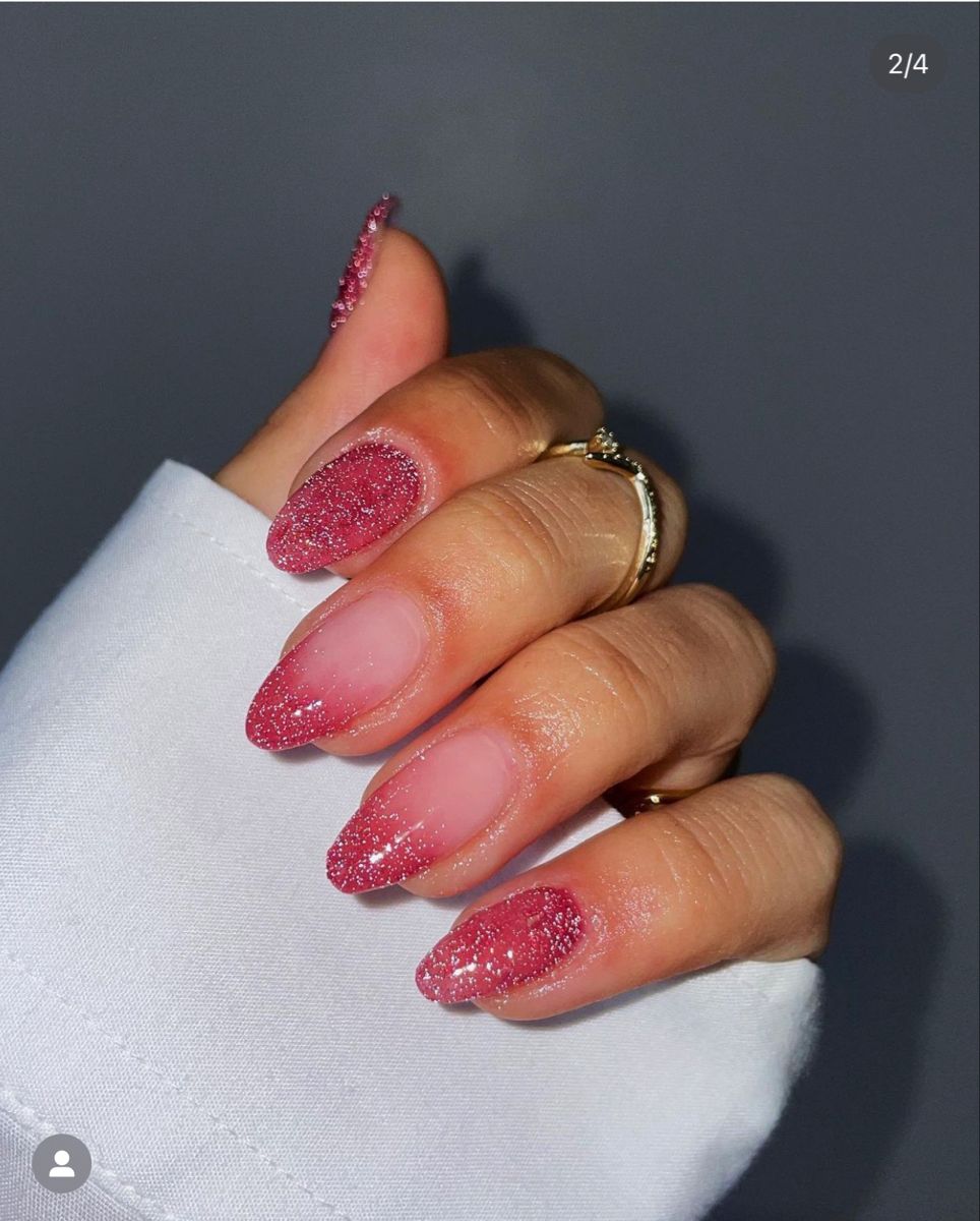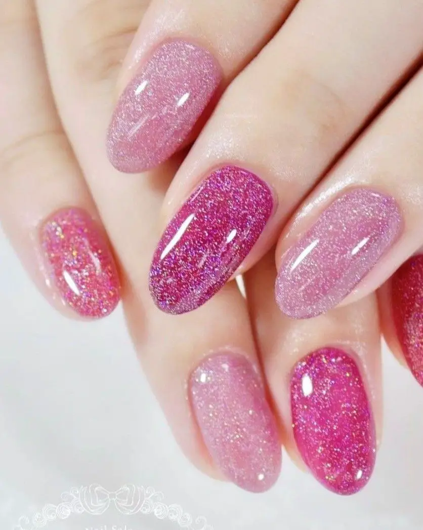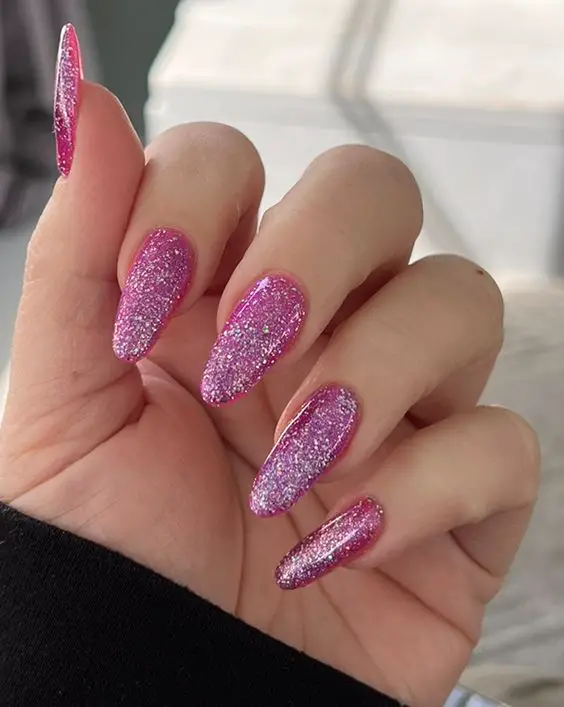 From baby pink shimmer to bold hot-pink sparkle, this trend is incredibly versatile. You can go soft and subtle with a rosy glitter wash, or full-on extra with chunky glitter and glam accents. Plus, pink is one of the easiest nail colors to pair with other shades—white, silver, nude, or even neon tones all look stunning with pink glitter. Whether you love short natural nails or long sculpted sets, there’s a glittery pink look that fits perfectly into your aesthetic.