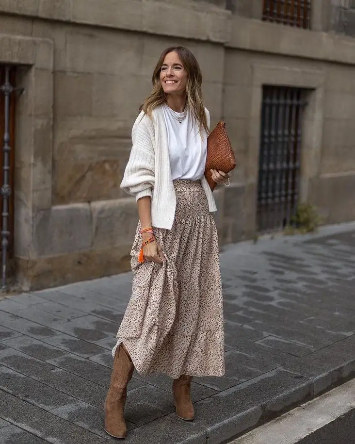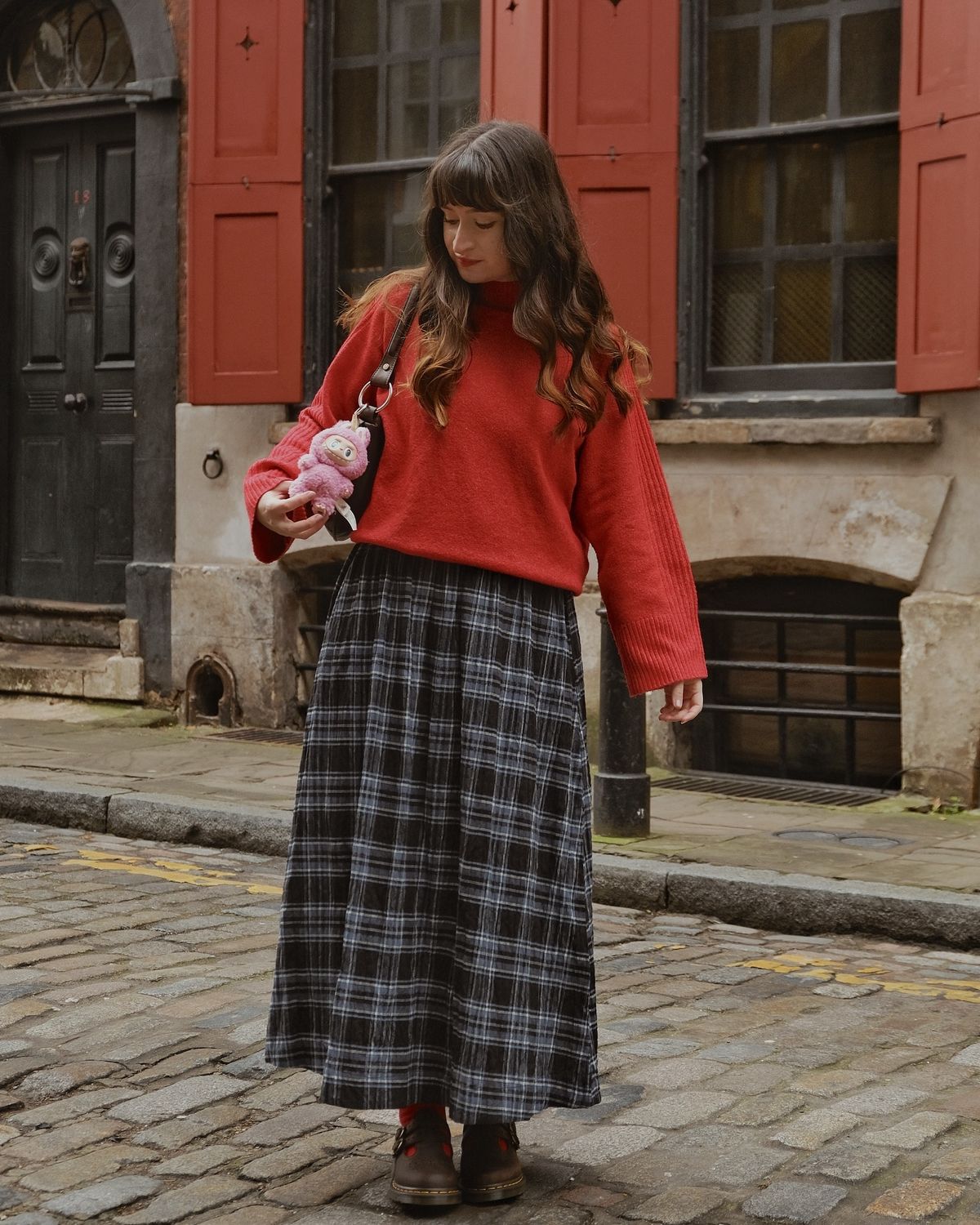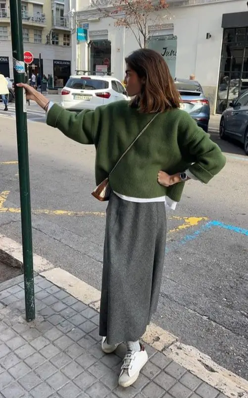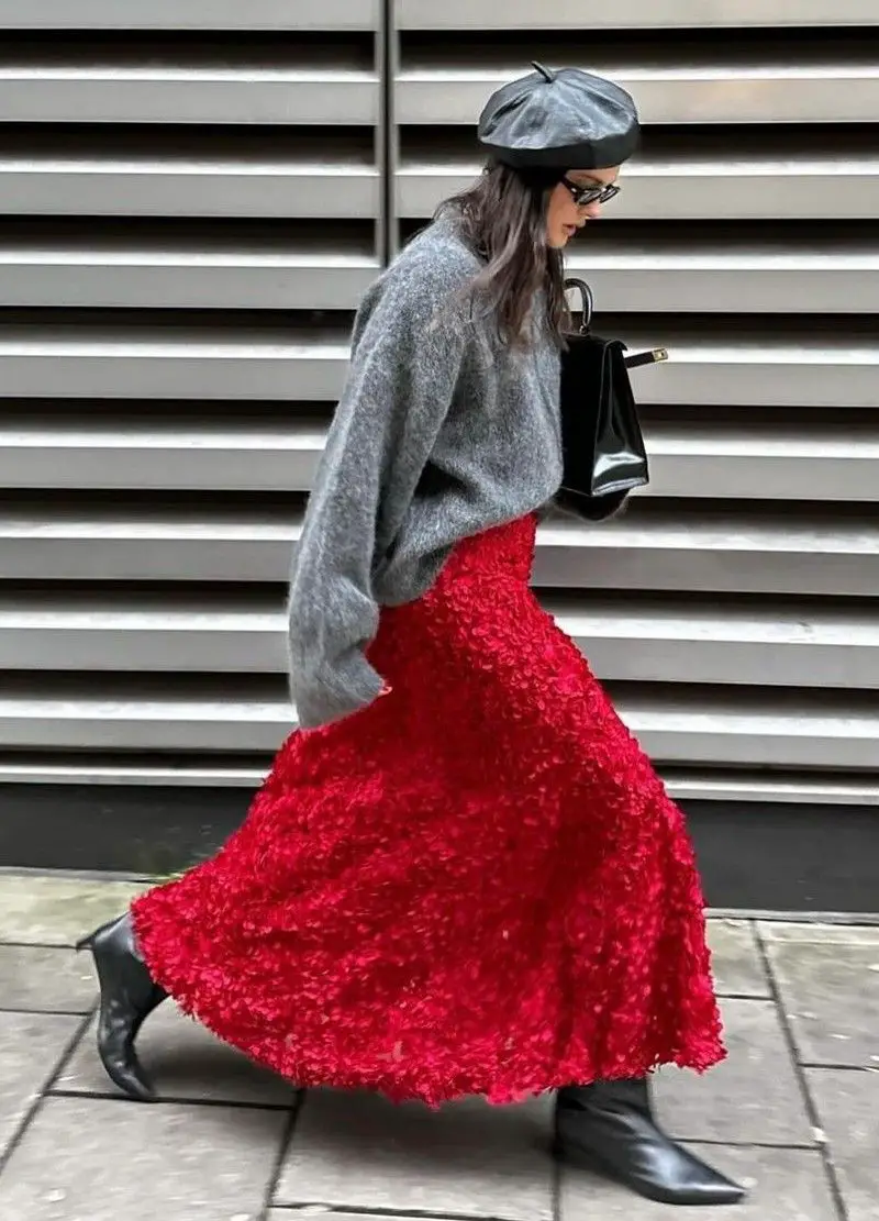 Winter maxi skirt styling is all about playing with textures and layers. Pair a pleated maxi with a fitted turtleneck and knee-high boots for an elevated city-girl look. Or opt for a wool or corduroy maxi teamed with a cropped jacket for an outfit that feels both cozy and put-together. Want to go bold? Try mixing prints—plaid skirts with oversized scarves or patterned knits. Don’t forget to accessorize with statement belts, chunky jewelry, or berets to complete your winter vibe.