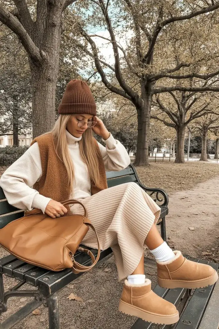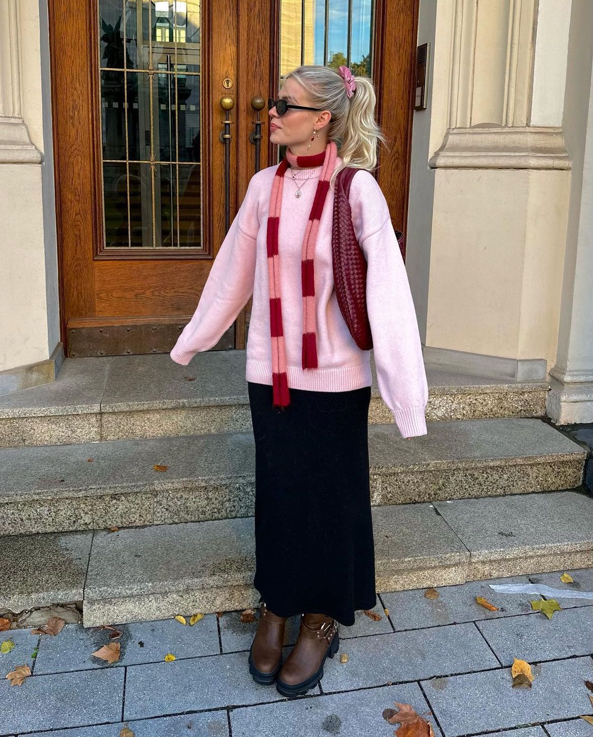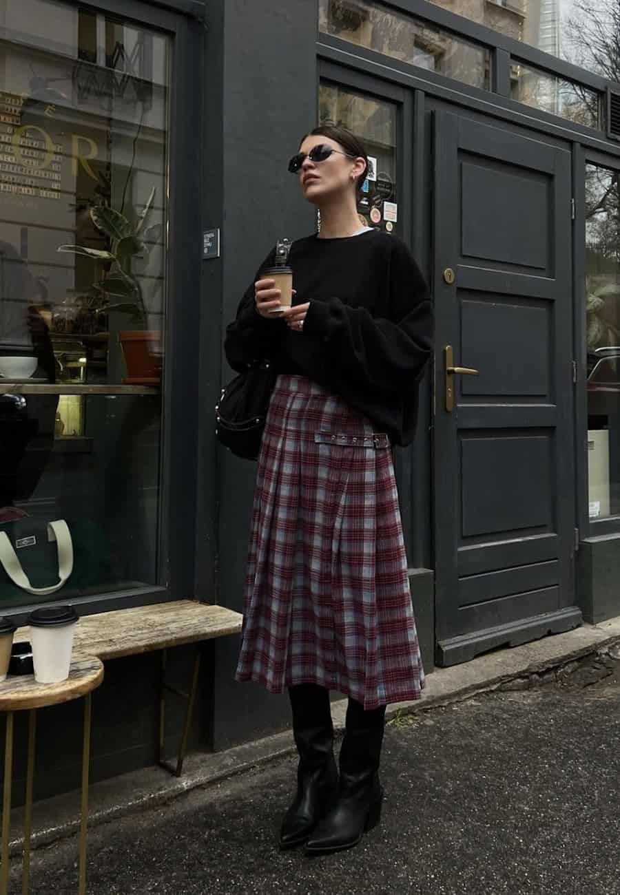 Winter maxi skirt styling is all about playing with textures and layers. Pair a pleated maxi with a fitted turtleneck and knee-high boots for an elevated city-girl look. Or opt for a wool or corduroy maxi teamed with a cropped jacket for an outfit that feels both cozy and put-together. Want to go bold? Try mixing prints—plaid skirts with oversized scarves or patterned knits. Don’t forget to accessorize with statement belts, chunky jewelry, or berets to complete your winter vibe.