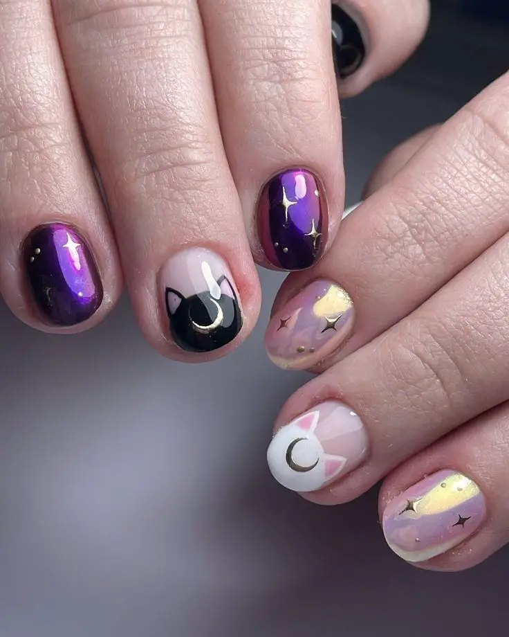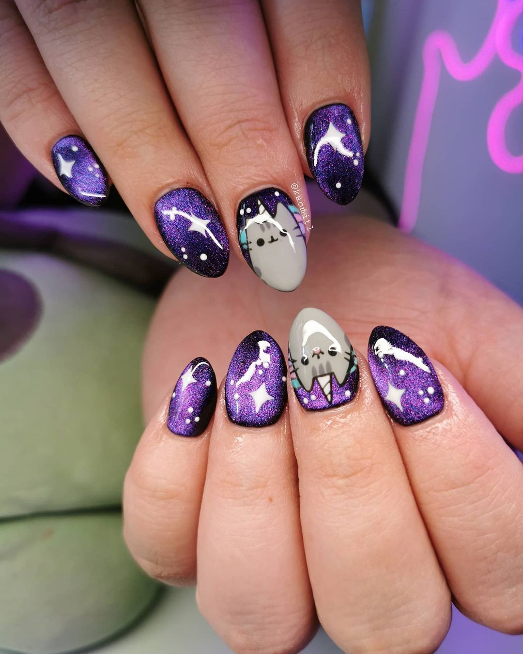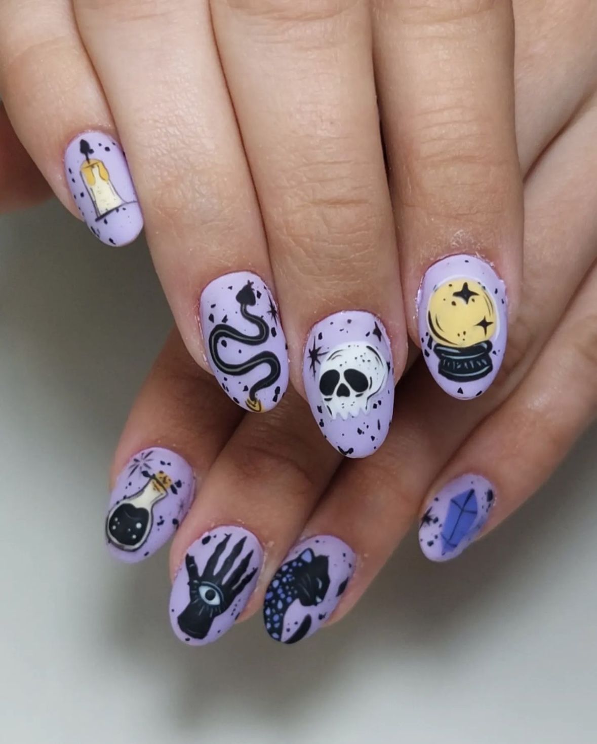 Combine celestial vibes with Halloween magic in a purple mani featuring planets, stars, and mystical cats. This design feels enchanting and cosmic, blending astrology-inspired details with witchy charm. It’s whimsical, dreamy, and totally unique for spooky season. Ideal for those who love blending mystical energy with festive Halloween flair.