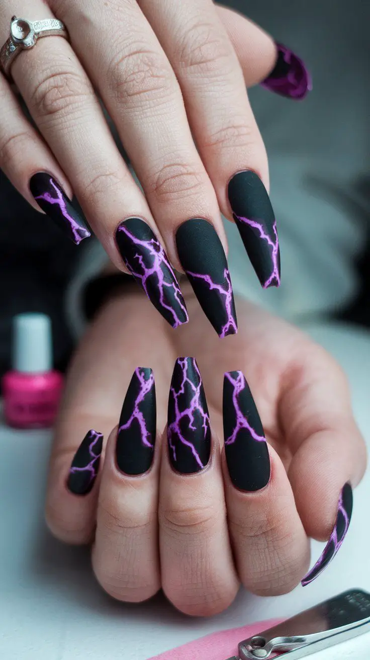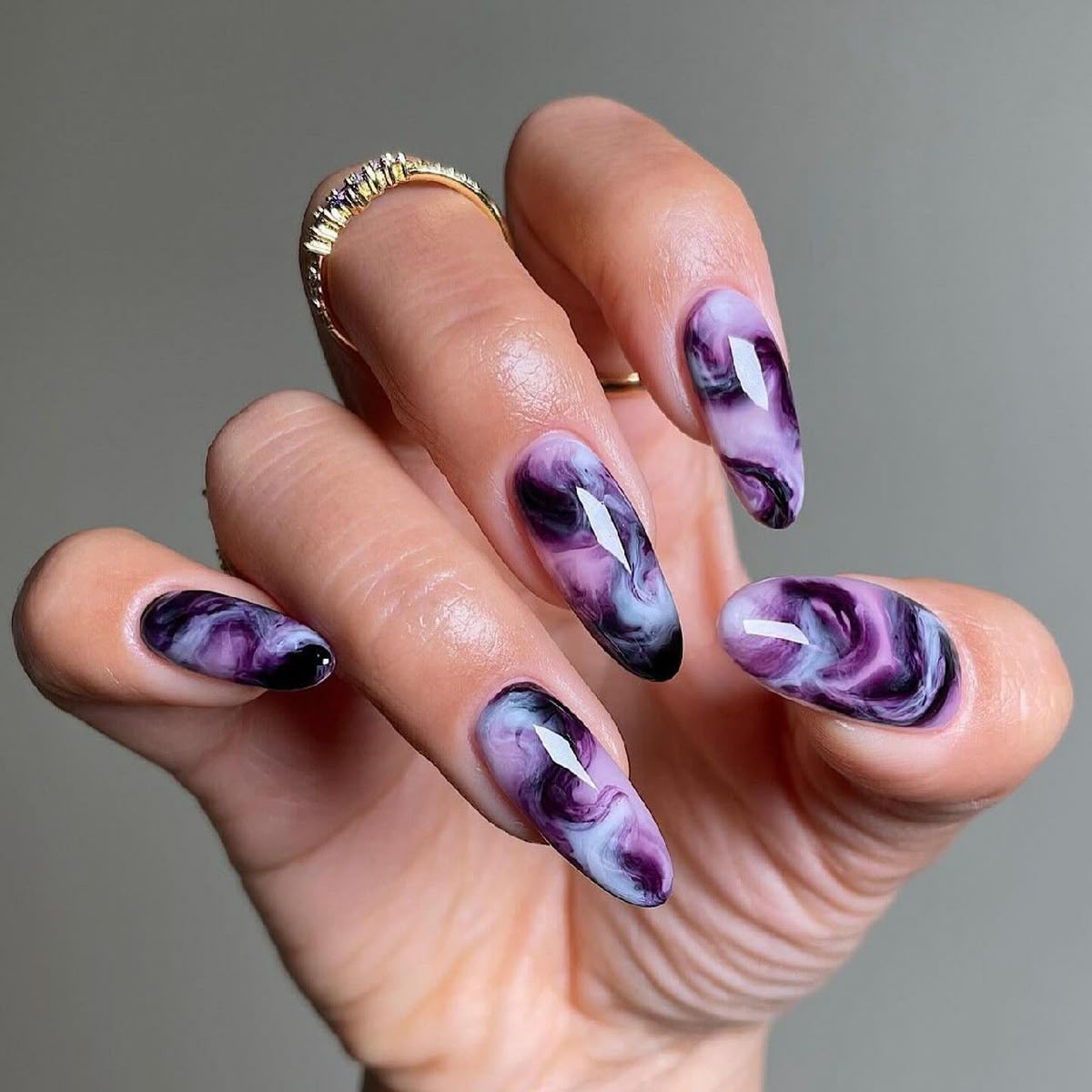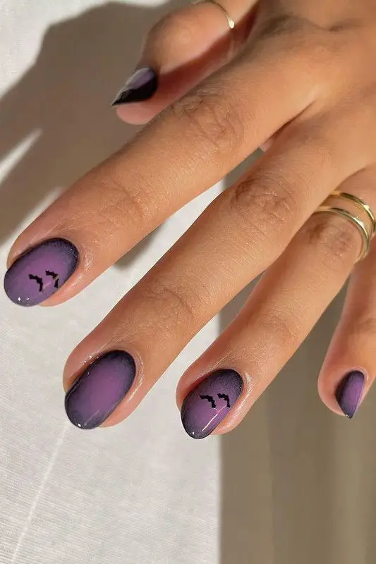 Mysterious and magical, a smoky purple effect makes your nails look like they’re wrapped in mist from a witch’s cauldron. This design blends purples and blacks in a swirling, ghostly way that feels haunting yet chic. Perfect for anyone who wants subtle spooky vibes without heavy detail.