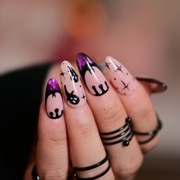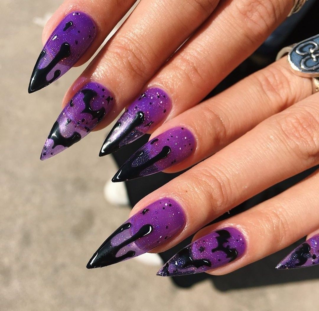 Combine classic Halloween bats with eerie drip art for a mani that screams spooky chic. Purple polish serves as the haunting backdrop, while bat silhouettes flutter among black or silver dripping accents. This bold combo feels creepy yet stylish, perfect for party nights. Whether glossy or matte, these nails bring just the right touch of dark drama.