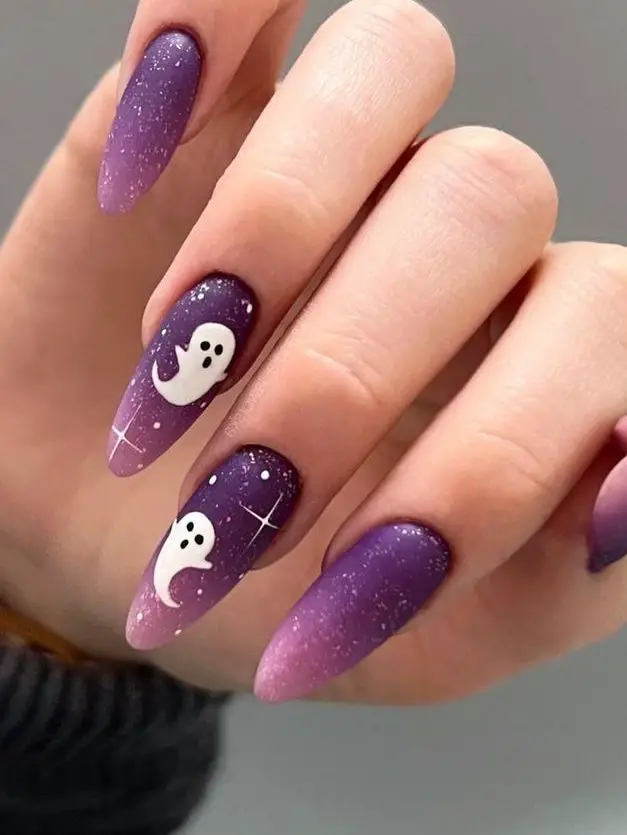 Adorable white ghost designs floating across purple polish create the ultimate “spooky but cute” mani. Perfect for those who want festive vibes without full-on scary details. Add glittery accents or pastel purples for an extra sweet finish. These playful ghosties make your Halloween nails fun, flirty, and Instagram-worthy.