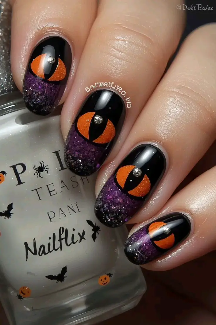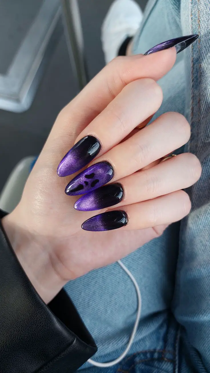 Dark and haunting, this midnight purple ombré gives your nails a vampy vibe that feels straight out of a Halloween spellbook. Blending black into deep purple, it’s moody, mysterious, and perfect for anyone who wants a chic yet spooky style. Pair it with matte finish for extra drama, or add glossy shine for a glam twist.