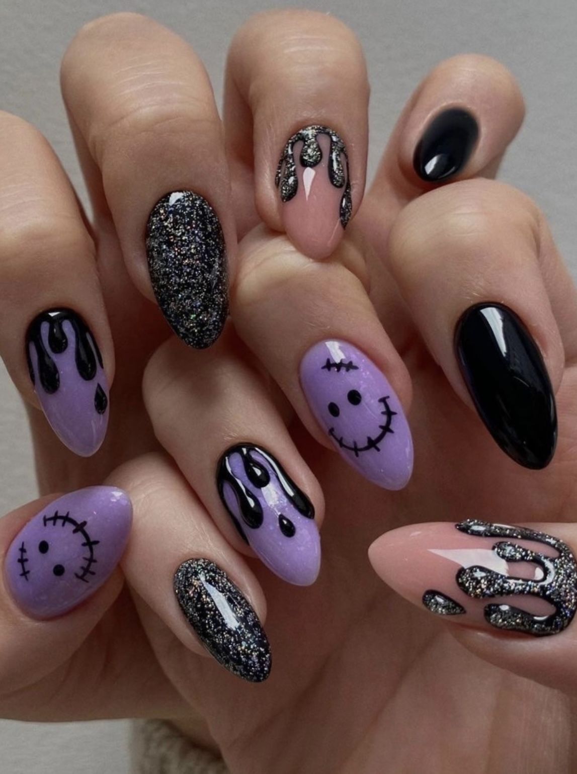 For a quirky Halloween twist, go for spooky smiley faces over purple polish. Think neon purple bases with creepy or cute smiley details in black or silver. This design is unexpected, fun, and guaranteed to stand out at any Halloween gathering. It’s playful with just the right spooky touch.