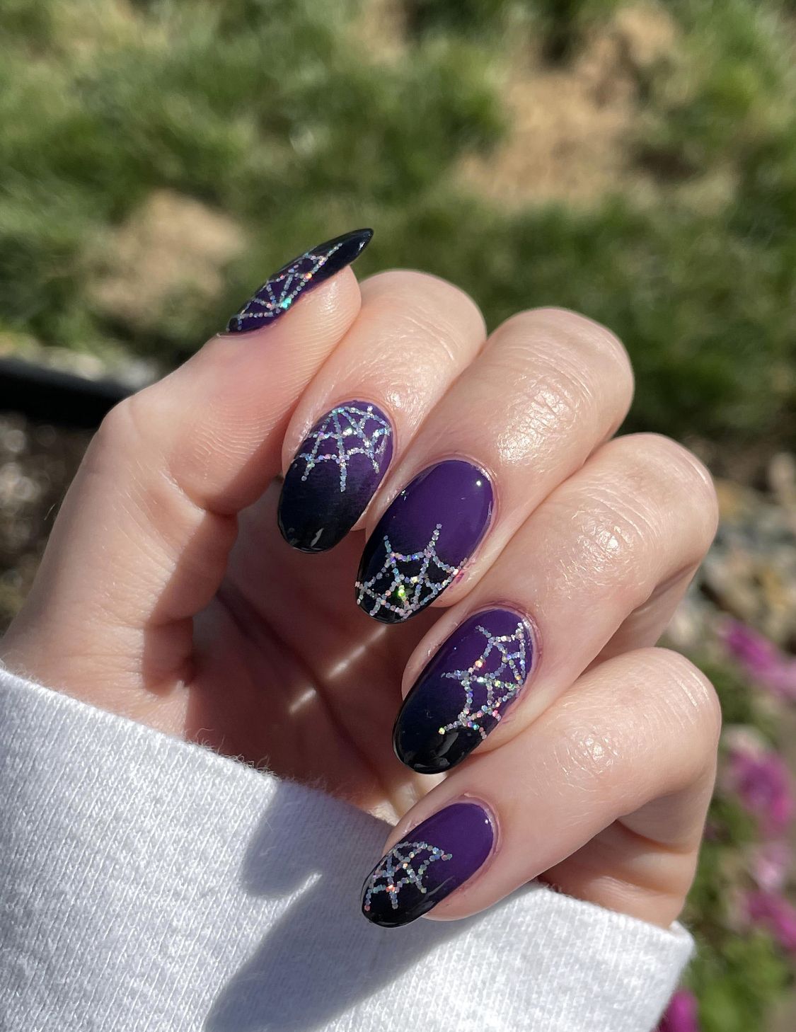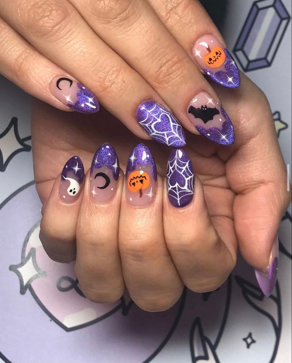 Take the creepy-crawly theme up a notch with spiders and webs across purple nails. From tiny crawling spiders to detailed web art, this design is hauntingly cool. A glittery purple base makes the look more glamorous, while matte finishes give it eerie edge. Perfect for bold Halloween nail lovers.