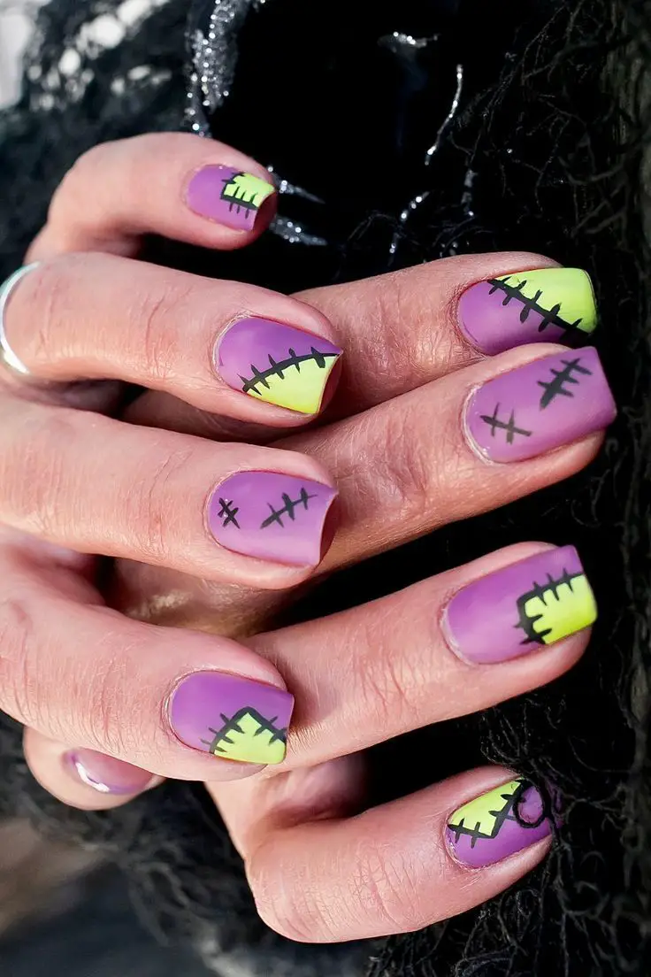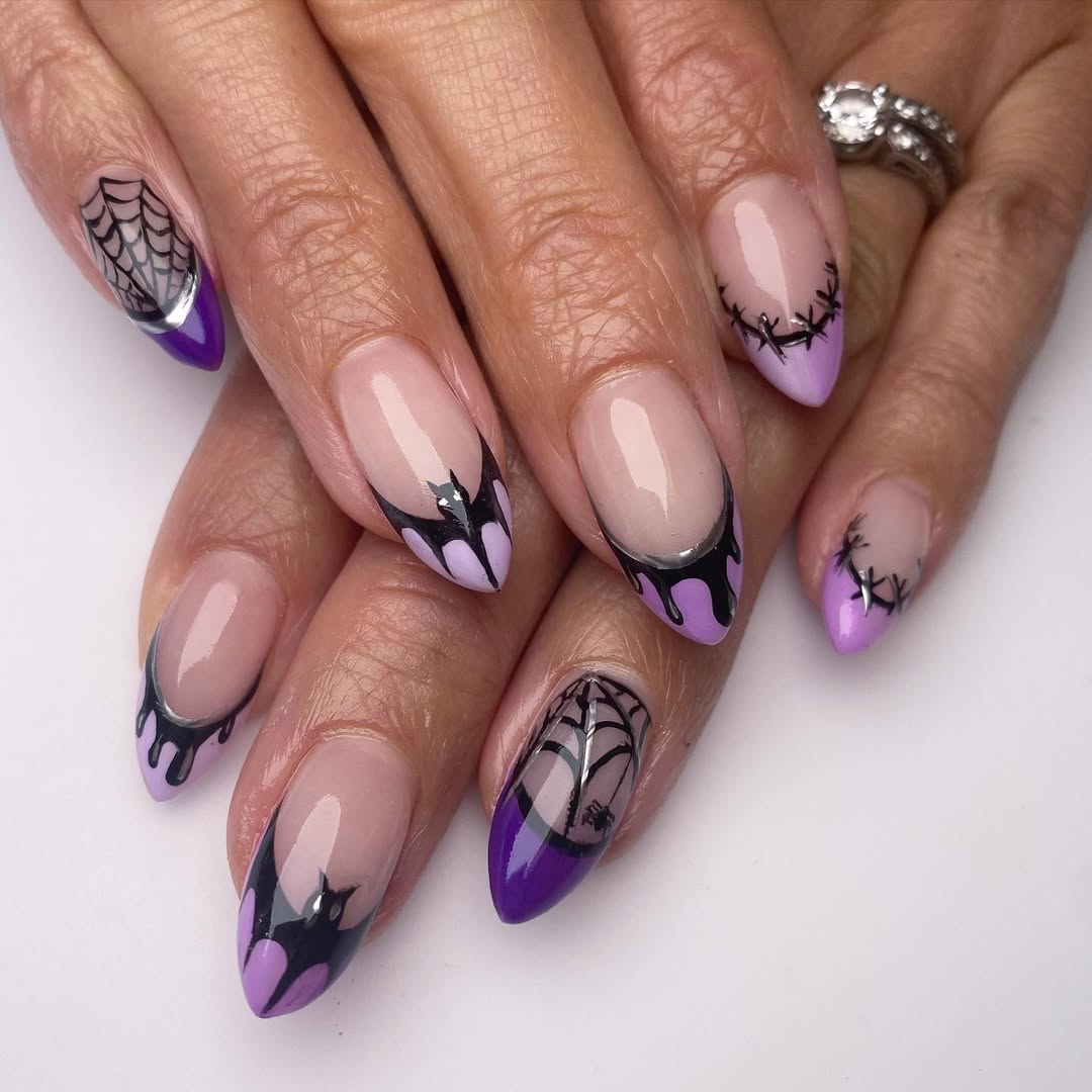 For a creepy, gothic vibe, mix purple polish with blood-red dripping tips. The contrast is spooky yet eye-catching, creating a horror-inspired look perfect for Halloween. Whether it’s glossy or matte, the “dripping blood” effect looks chilling and artistic. Add a few accent rhinestones for an even darker glam touch.