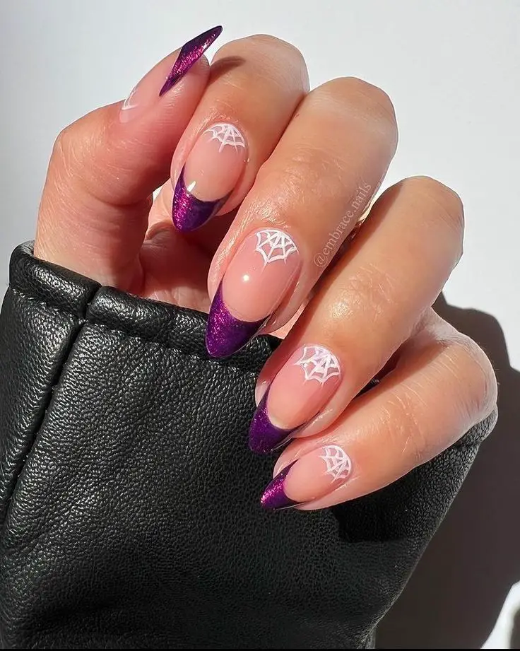 French tips meet spooky elegance with a glitzy purple twist. Add spiderweb accents over sparkling purple French tips for a hauntingly glamorous effect. The glitter makes it party-perfect, while the webs keep it Halloween-themed. Ideal for anyone who wants both glam and creepy vibes in one festive mani.