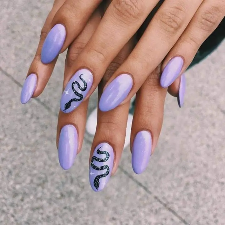 Snake-inspired purple nails with sleek, slithering patterns bring dangerous elegance to your Halloween mani. Glossy scales or snake-shaped accents over deep violet polish create a mesmerizing design. Perfect for serpent lovers and those channeling a sly, venomous vibe this spooky season. Fierce, fashionable, and totally unique for Halloween.
