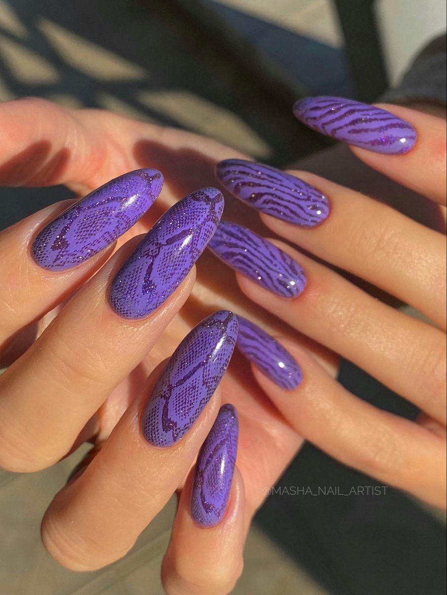 Textured snake skin designs in shimmering purples bring edgy vibes to your Halloween mani. From embossed 3D looks to intricate hand-painted scales, this style slithers with spooky charm. Pair with coffin or stiletto nail shapes for maximum drama. Bold, mysterious, and dangerously chic, this look is a fang-tastic choice.