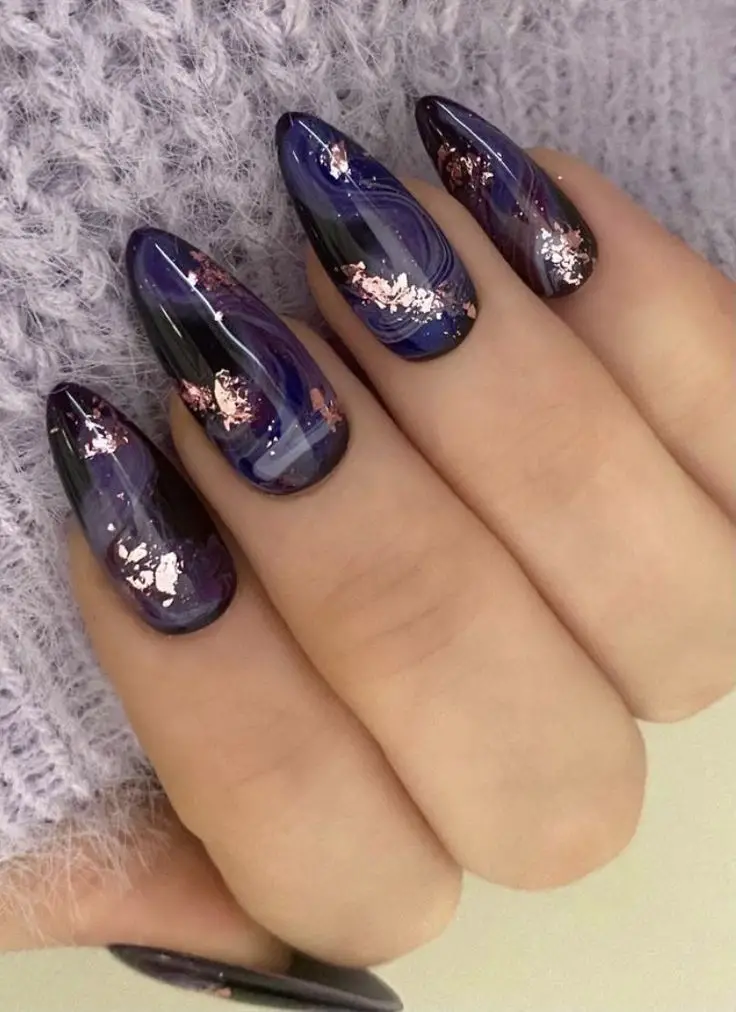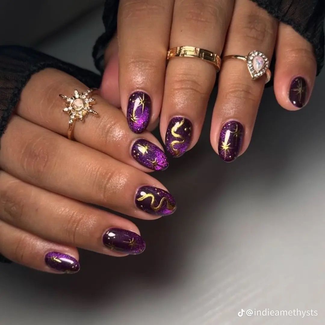 For a glam-spooky vibe, matte violet nails paired with gold foil accents create the perfect mix of eerie and elegant. The gold shimmers like candlelight against the deep purple, giving your mani a hauntingly luxe feel. Ideal for anyone who loves dramatic nails with a high-fashion Halloween twist.