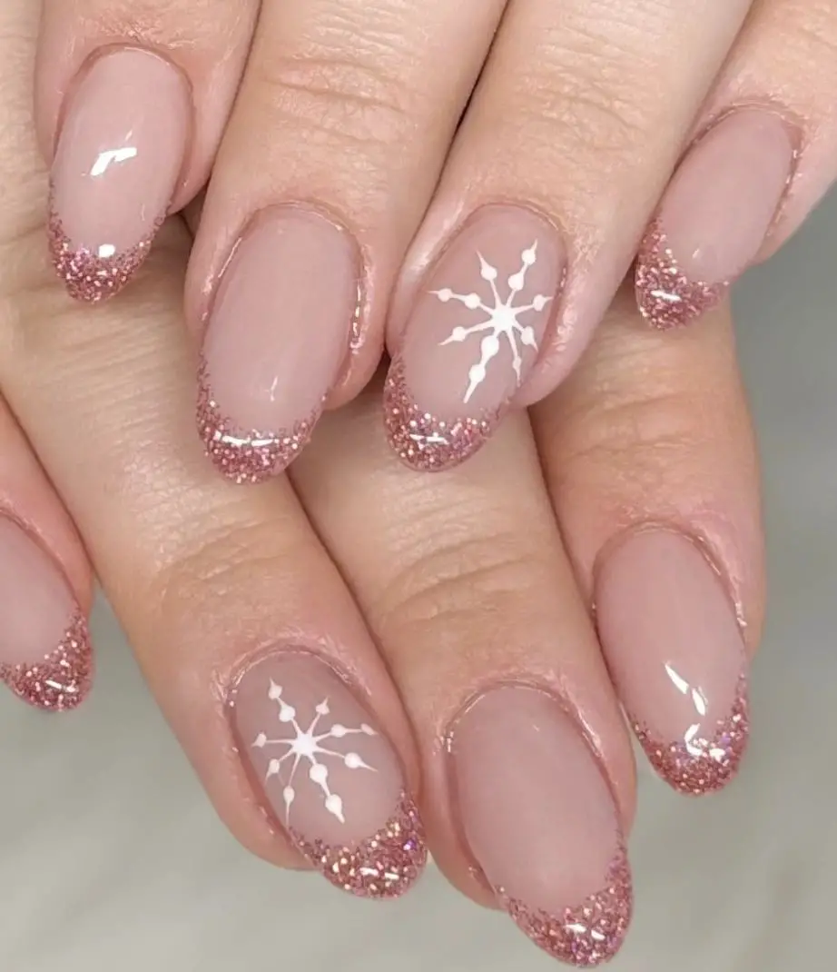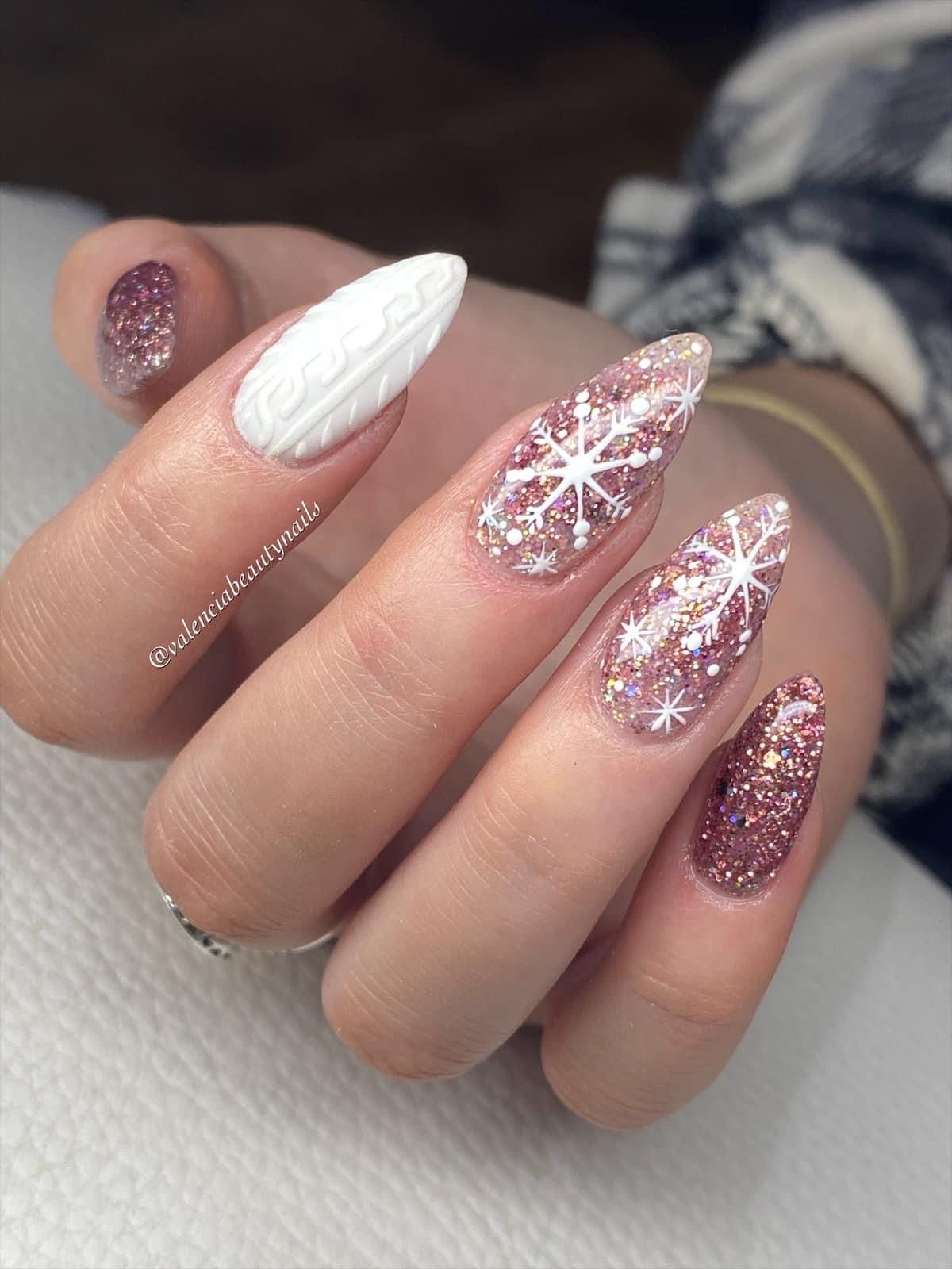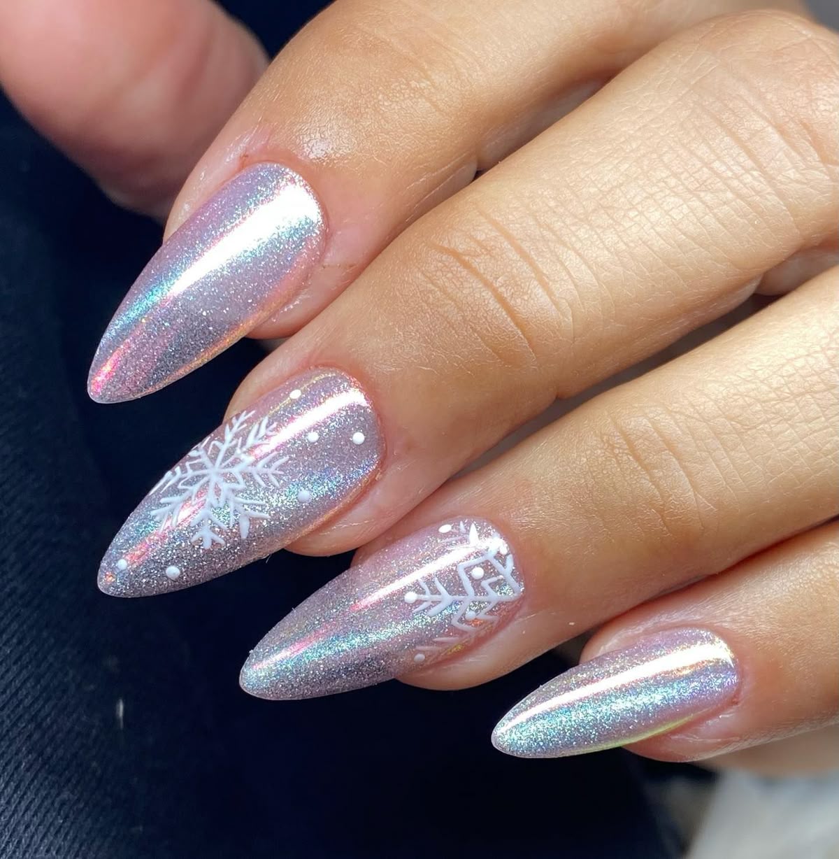 You can go full snow princess with chunky glitter and chrome flakes, or keep it chill with whisper-thin white snowflake line art over a sheer nude. Either way, the vibe stays immaculate. It’s that perfect balance between festive and classy, giving your hands that “I sip peppermint lattes and have my life together” energy.