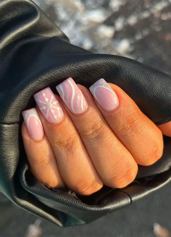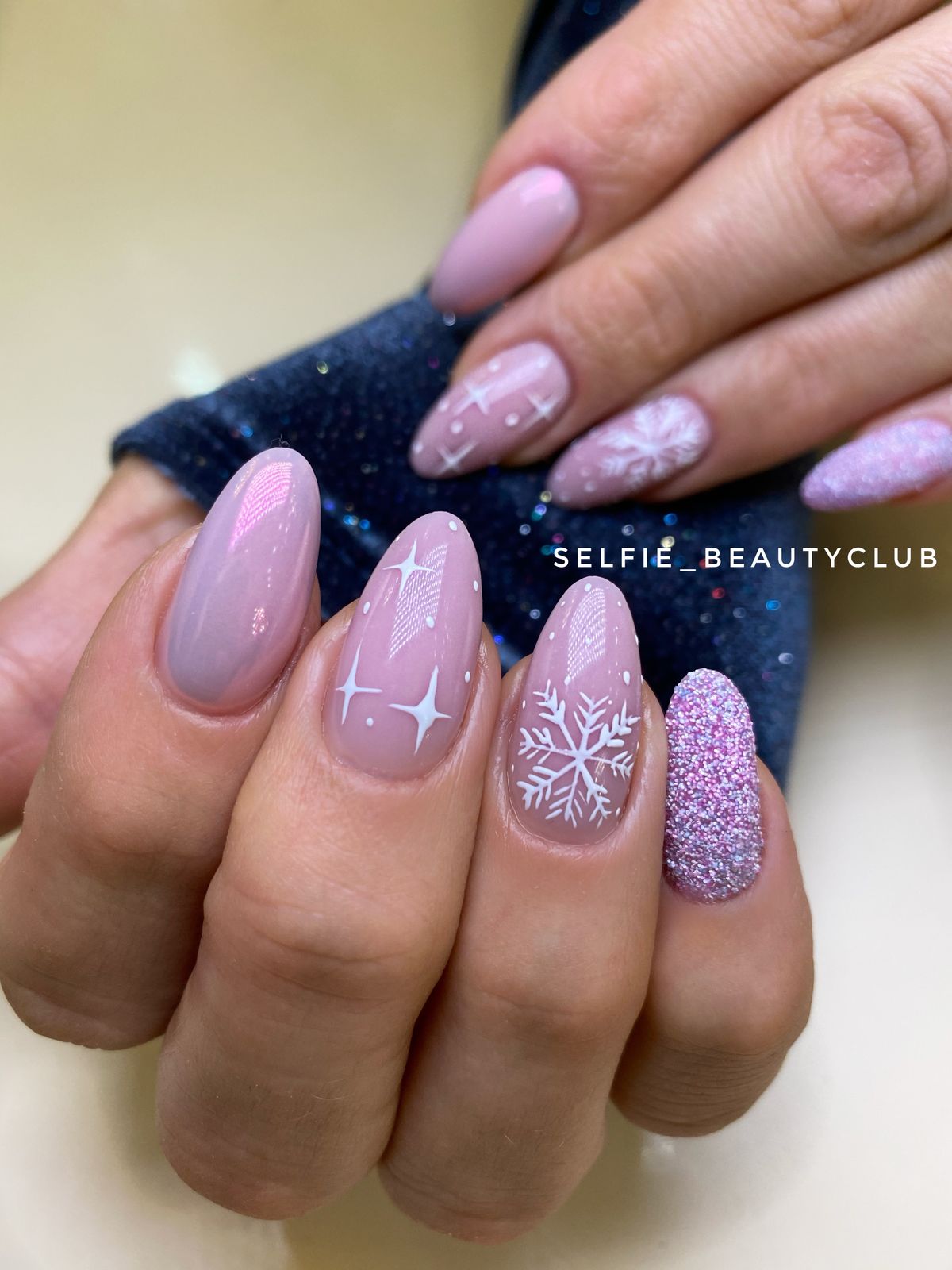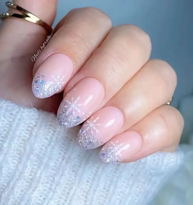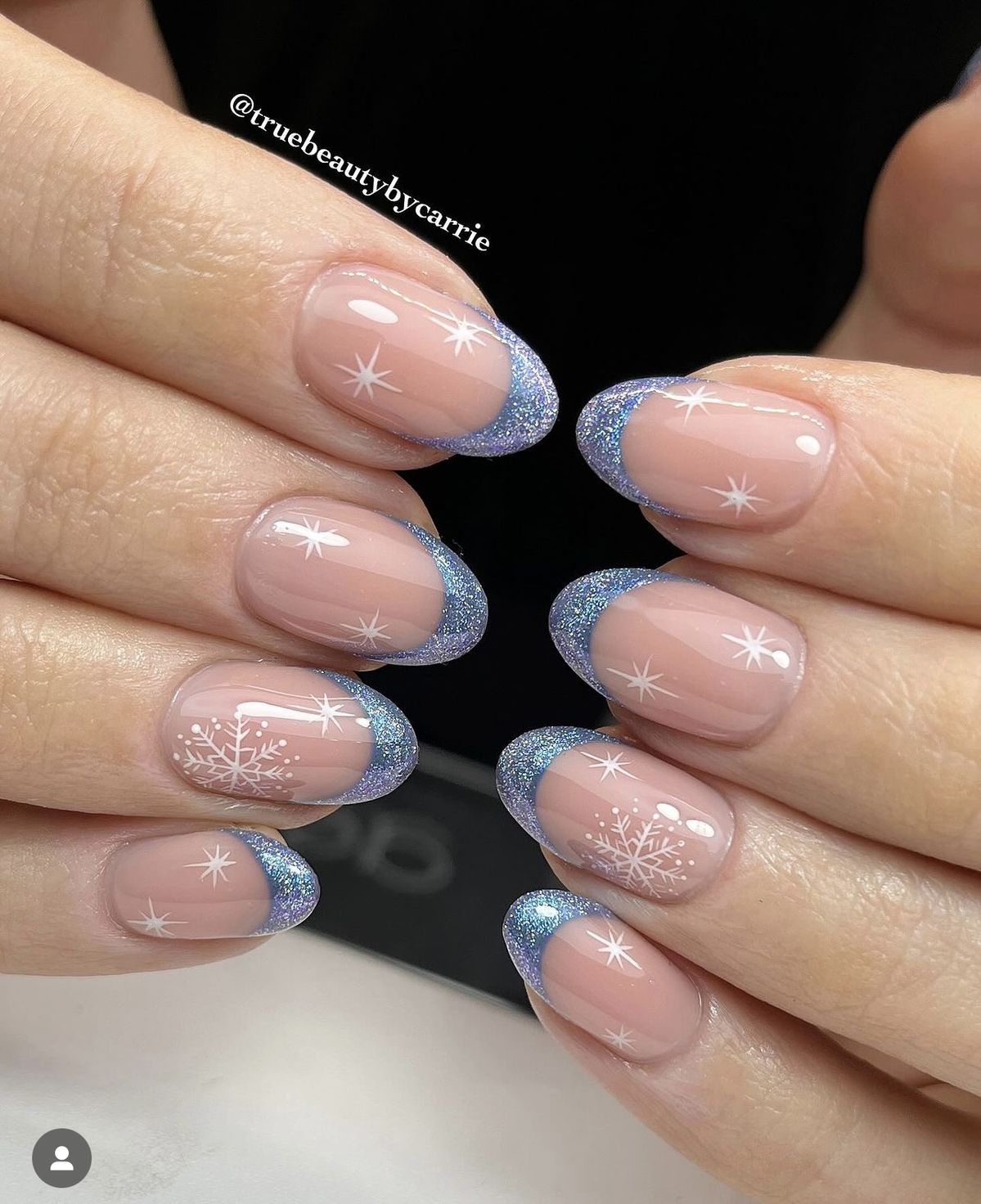 You can go full snow princess with chunky glitter and chrome flakes, or keep it chill with whisper-thin white snowflake line art over a sheer nude. Either way, the vibe stays immaculate. It’s that perfect balance between festive and classy, giving your hands that “I sip peppermint lattes and have my life together” energy.