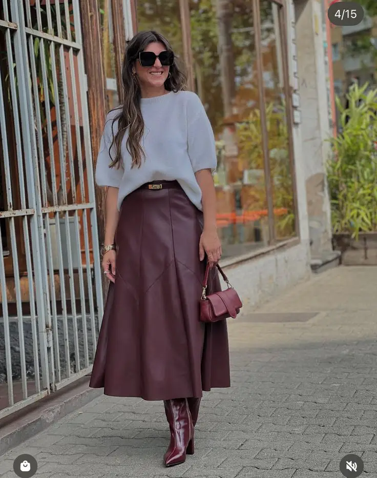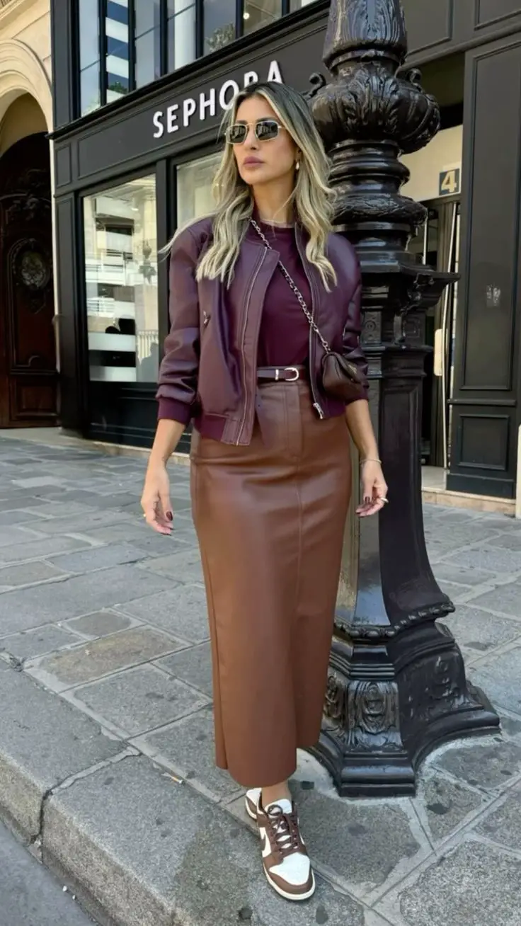 This season, fashion girls are embracing the timeless charm of leather with fresh twists — think pairing them with chunky knits, crisp white shirts, or even graphic tees for that “off-duty cool” aesthetic. You can keep it casual with sneakers and oversized sweaters or dress it up with heeled boots and structured blazers. The beauty of a leather skirt lies in how easily it transitions from day to night — perfect for brunch dates, city strolls, or after-work cocktails.