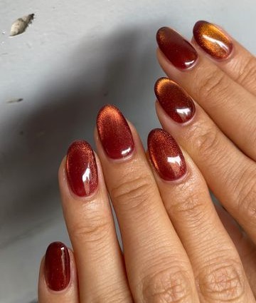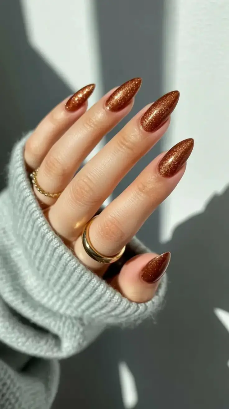 Warm metallics grounded in bronze, terracotta, or rust tones. This shade bridges fall and winter — rich, cozy, and autumnal but with a glow that suits cold nights. Use in subtle shimmer form rather than full foil, so the glow feels warm, not harsh. It pairs beautifully with leather, tweed, and bronze accessories.