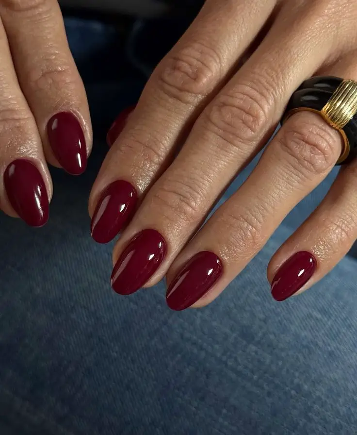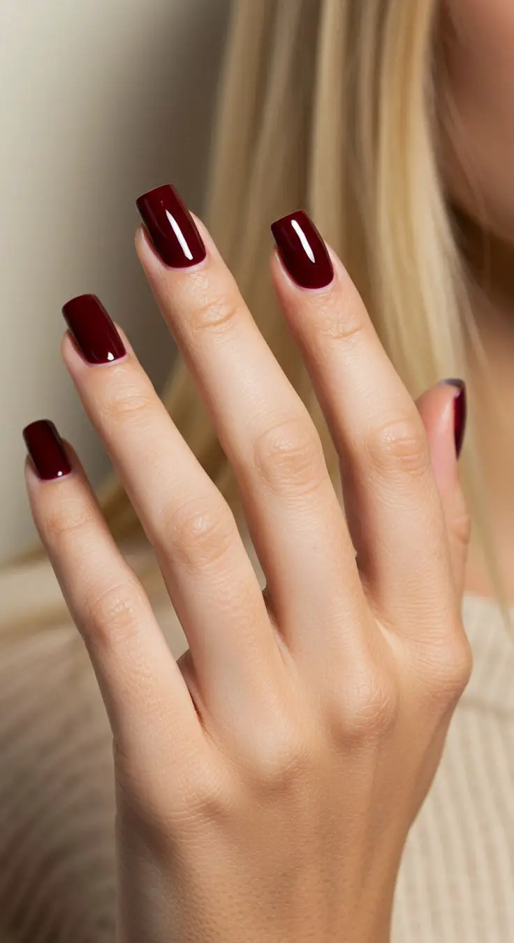 An elegant, moody red with plum or berry undertones that shift with light. This shade is rich and opulent, acting as a winter “neutral” that still commands attention. With just the right balance of red and dark tones, it evokes wine in candlelit dinners or luxurious evenings. A glossy top coat amplifies its depth and makes it feel expensive.